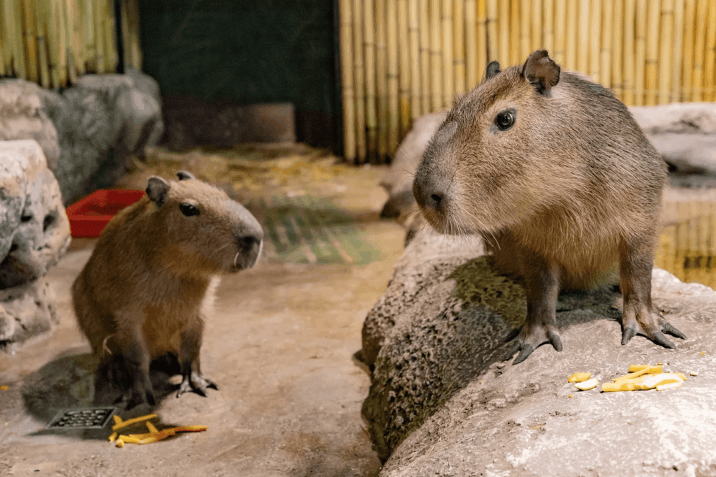 Есть успешные примеры содержания капибар в контролируемых условиях. Один из самых известных — японский зоопарк Izu Shaboten Zoo, где животные купаются в теплых ваннах и чувствуют себя комфортно даже зимой. В США появились тематические кафе, где посетители могут наблюдать за капибарами или взаимодействовать с ними под присмотром специалистов.